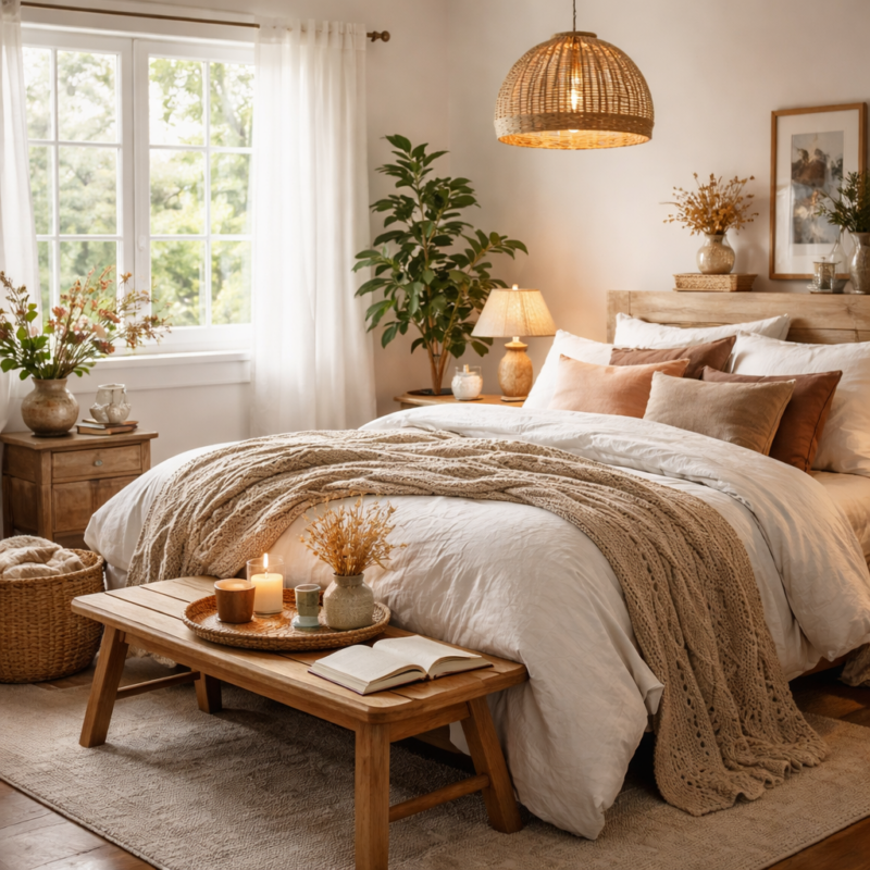 - Textiles chaleureux — plaid en laine ou imitation douce, taies et housses en coton ou lin, tapis moelleux près du lit pour un pas qui réconforte.