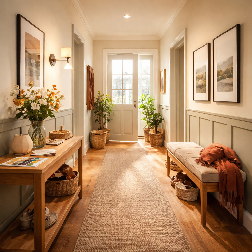 • Entrée ou couloir : carreaux au sol pour une première impression accueillante et durable ; pensez à un tapis pour adoucir l’ensemble.