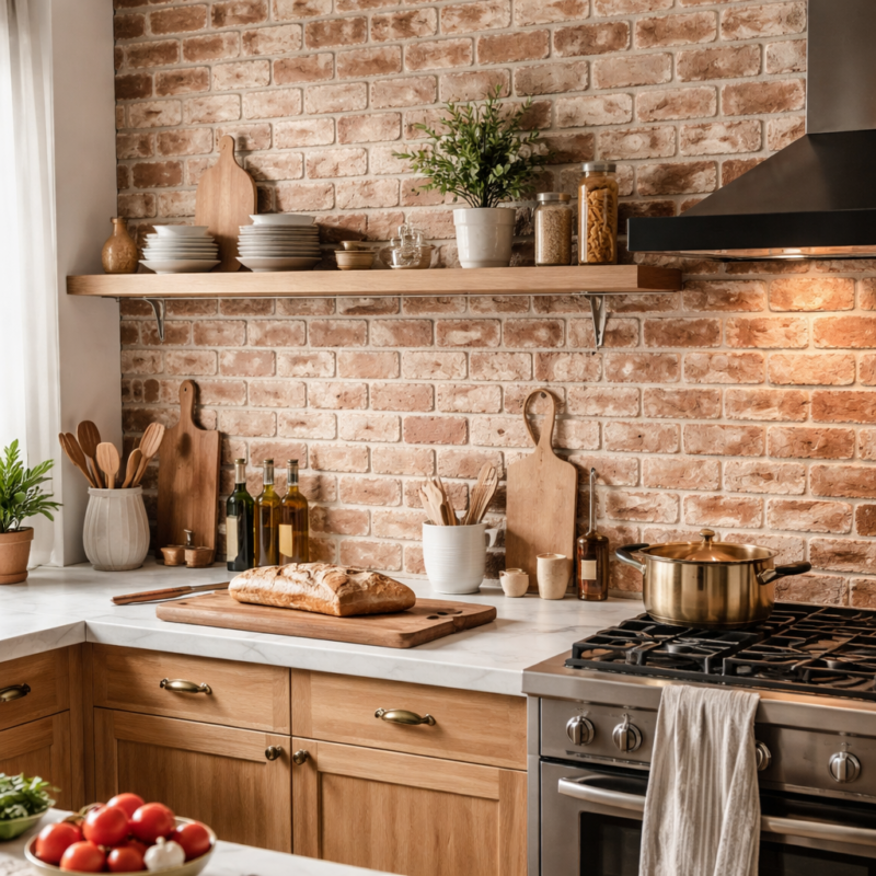 - Rustique doux : brique apparente + étagères en bois clair pour une ambiance cocon.