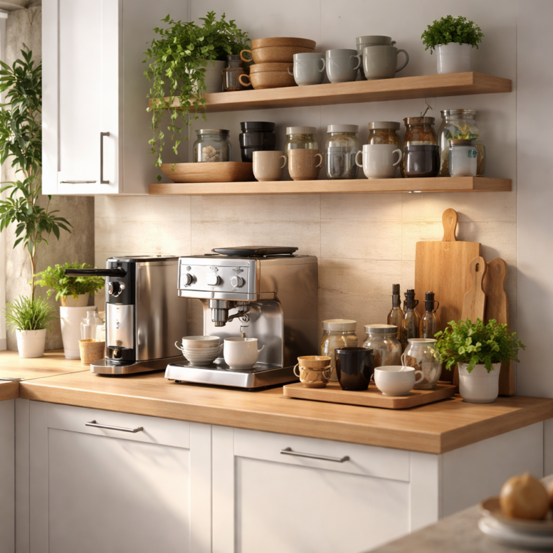 La tendance est claire : de nombreux foyers réservent désormais un pan de mur ou un recoin pour le café. Ce n’est pas seulement esthétique — c’est un vrai levier pour gagner du temps le matin, éviter le bazar sur le plan de travail et instaurer un point de rencontre chaleureux pour la maison. Pour une personne occupée, ce micro-espace transforme la routine en rituel de soin.
