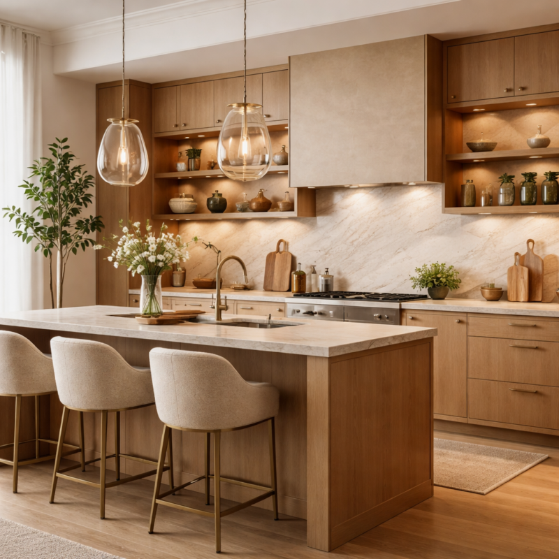 Les accessoires cohérents — textiles naturels, plantes et un petit plateau organisé — ajoutent la chaleur humaine qui transforme une cuisine fonctionnelle en lieu accueillant. Un luminaire-signature au-dessus de l’îlot ou une suspension en laiton brossé crée immédiatement un effet boutique sans rénovation lourde.