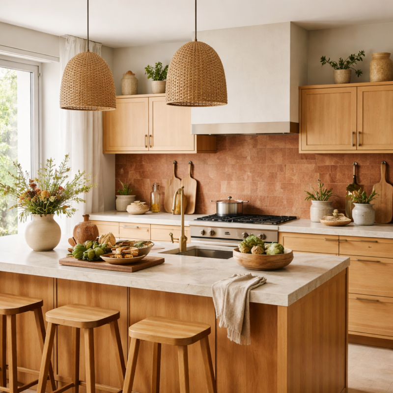 Cuisine saisonnière : crédence aux tons terre et placards en bois naturel pour une ambiance chaleureuse
