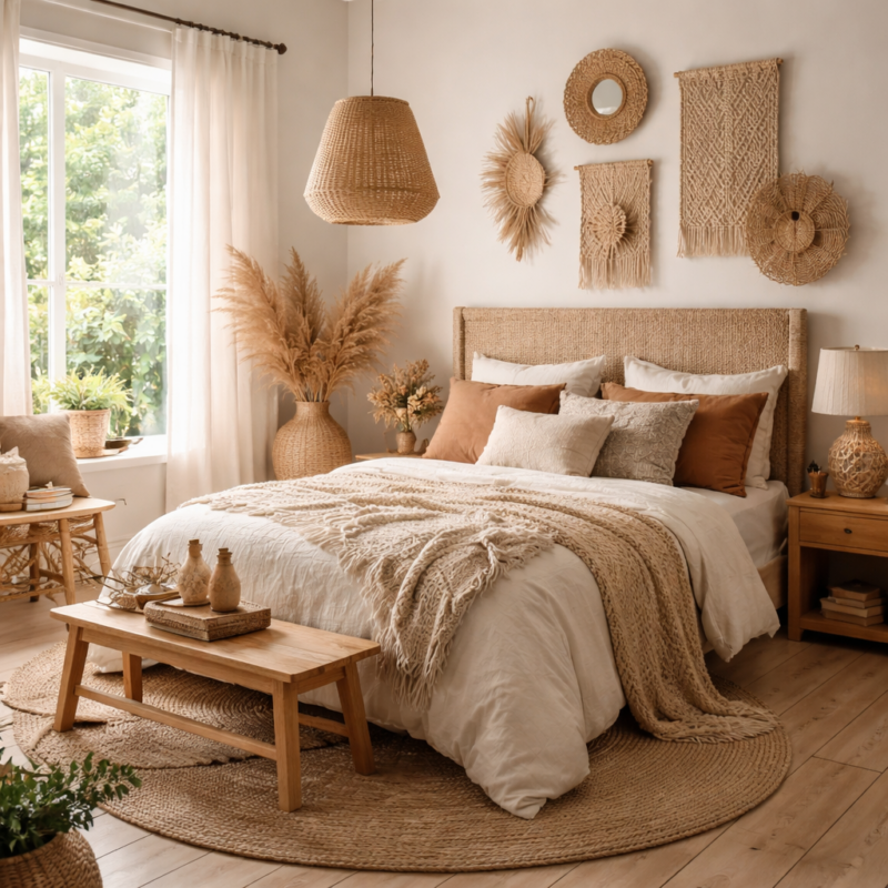 Les matières et textures sont le cœur du bohème chic : elles créent le toucher, la chaleur et la profondeur d’une chambre. Privilégiez des textiles naturels comme le lin lavé, le coton biologique et la laine mérinos pour apporter une sensation douce et accueillante sous la peau. Les finitions artisanales — franges, macramé, coutures apparentes — ajoutent une touche humaine et unique.