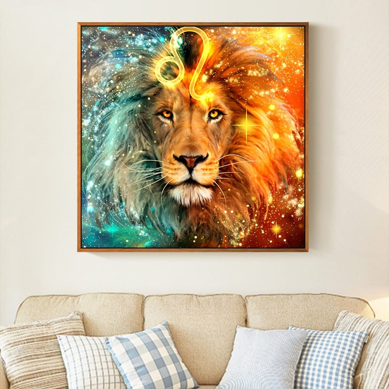 Un magnifique broderie diamant représentée par un lion majestueux et son signe astrologique.